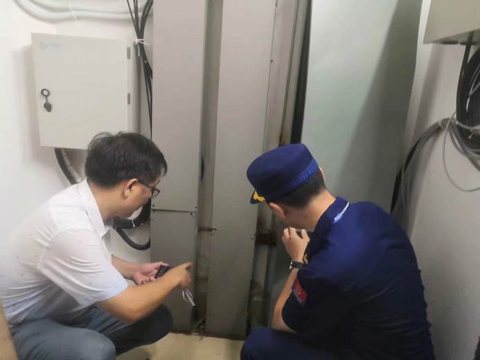 工作人员查看楼栋电房情况