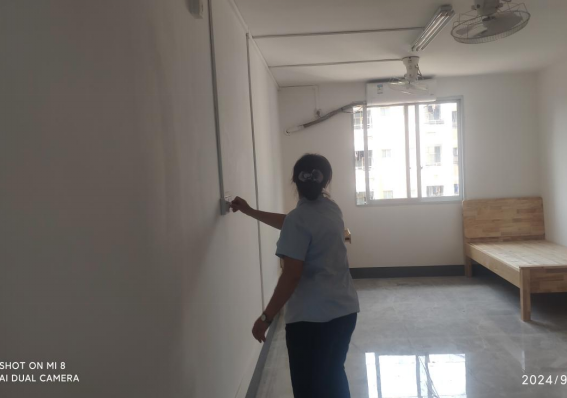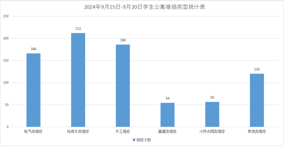 2024年9月15日-9月20日后勤服务24小时报修中心接电话报修、网上报修、现场报修1428单,其中学生公寓报修794单(已完工765单,完工率96.3%,余29单在维修中),其中电气类166单、给排水类212单、木工类186单、基建类54单、冷热水阀56单、其他类120单,余下634单由其他岗位负责完成维修。坚持对学生公寓183间配电房, 72个电表箱,2个水泵房每天巡检。