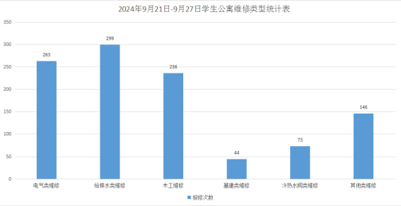 2024年9月21日-9月27日后勤服务24小时报修中心接电话报修、网上报修、现场报修1687单,其中学生公寓报修1061单(已完工1027单,完工率96.8%,余34单在维修中),其中电气类263单、给排水类299单、木工类236单、基建类44单、冷热水阀73单、其他类146单,余下626单由其他岗位负责完成维修。坚持对学生公寓183间配电房, 72个电表箱,2个水泵房每天巡检。