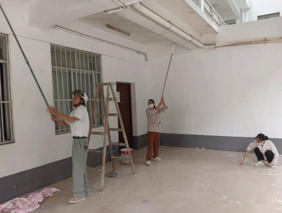 粉刷东31栋架空层学生公寓服务中心外围墙面