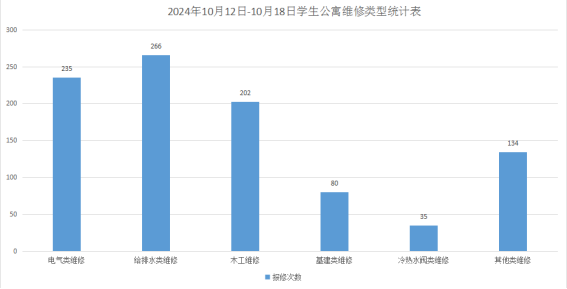 2024年10月12日-10月18日后勤服务24小时报修中心接电话报修、网上报修、现场报修1549单,其中学生公寓报修952单(已完工924单,完工率97%,余28单在维修中),其中电气类235单、给排水类266单、木工类202单、基建类35单、冷热水阀80单、其他类134单,余下597单由其他岗位负责完成维修。坚持对学生公寓183间配电房, 72个电表箱,2个水泵房每天巡检。