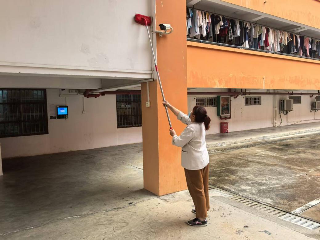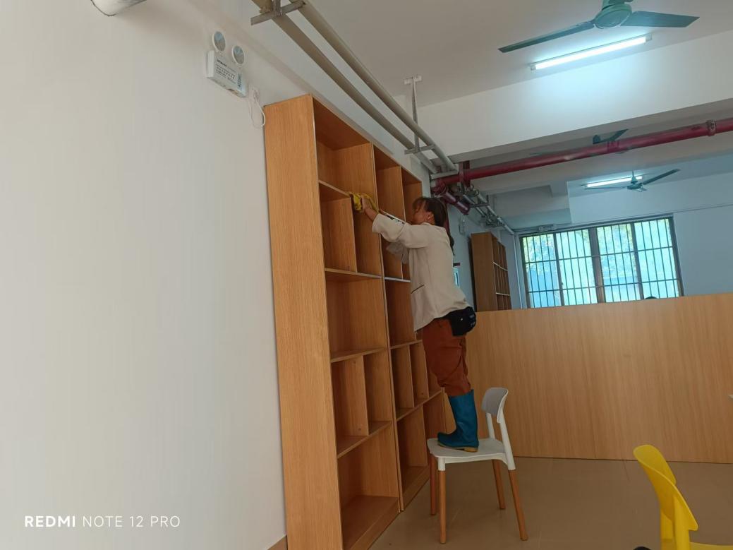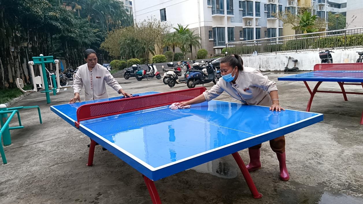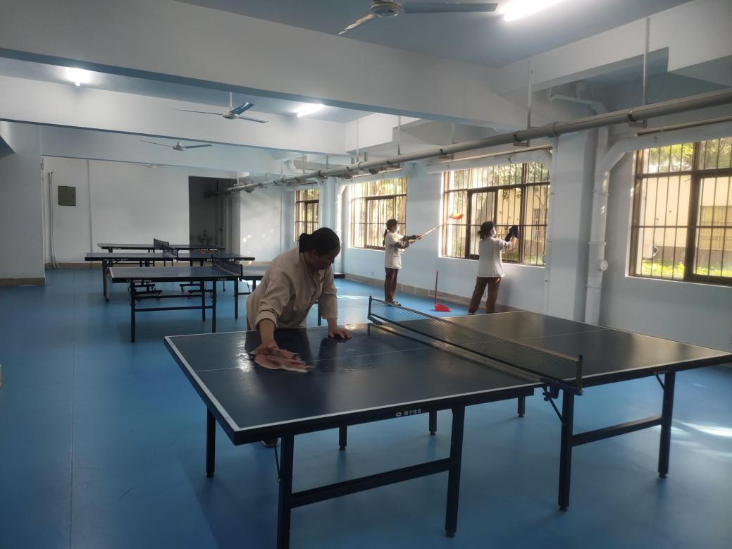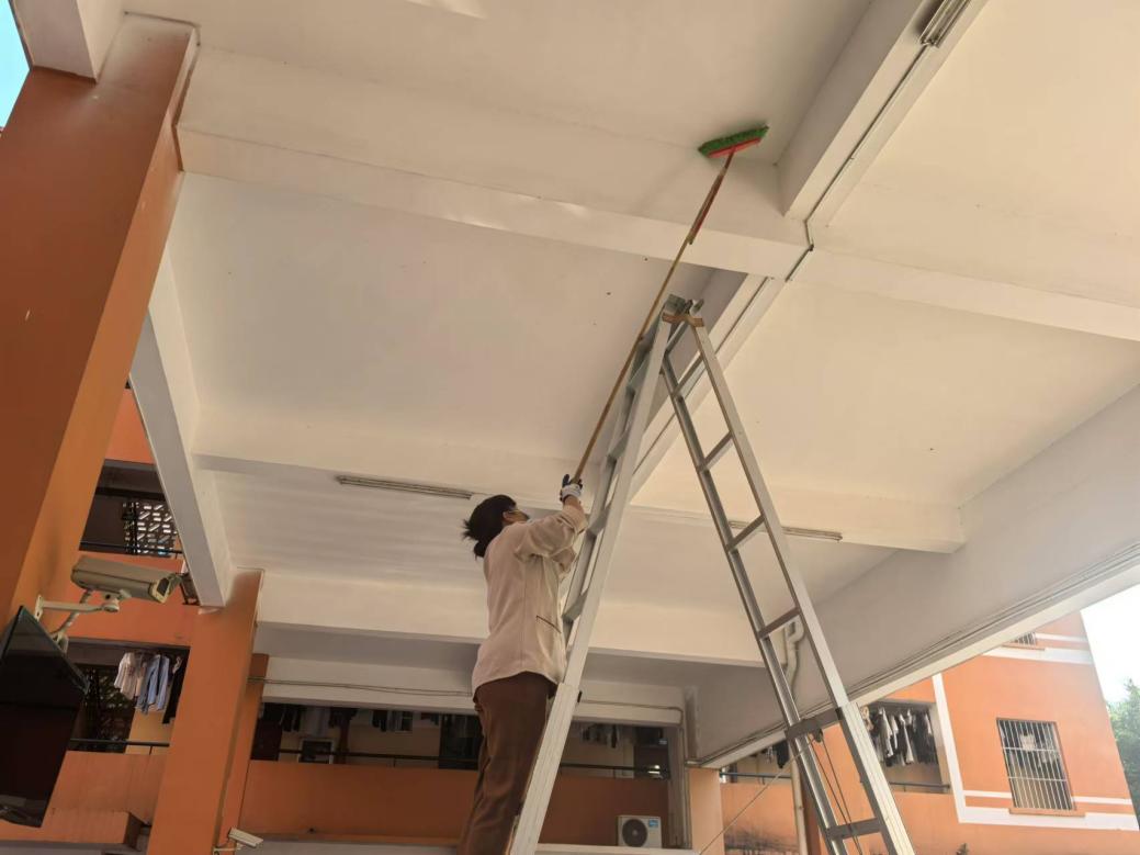 为营造学生公寓园区宜学宜居的环境,认真做好园区内消防设备设施、热水机组、洗涤设备等各种设备设施和39间自习室、9个多功能室的保洁维护工作;做好学生公寓园区内482个生活设施(其中公共长椅102张,乒乓球桌162张,晾衣架134个、健身器材84个)的维护工作。