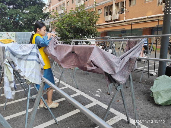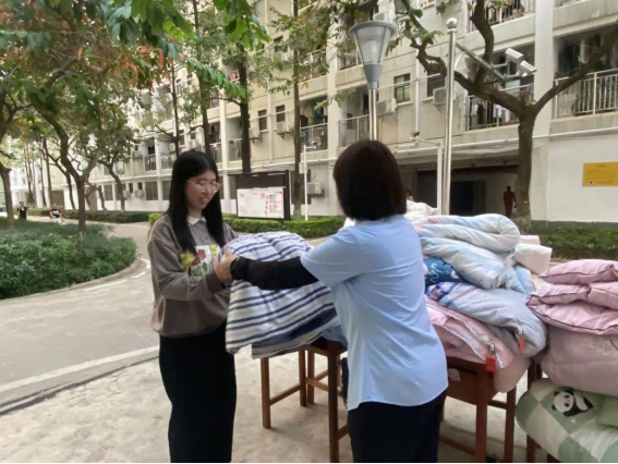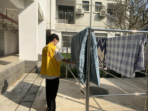 暖心服务:为进一步提高服务品质,给学生提供更便捷的服务,营造舒适和谐的居住环境,增进与学生之间的交流和情谊,学生公寓推出“冬日温暖,加‘被’温馨”活动,宿管阿姨设晾晒专场,上门服务,给同学们晾晒被子。同学们纷纷响应,学生公寓于11月15日开始云接单为同学们晾晒被子,截止11月15日共计帮助学生晾晒被子123件。