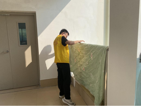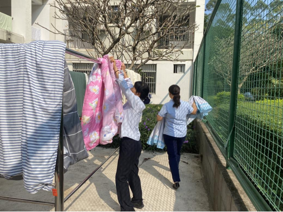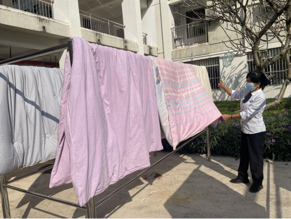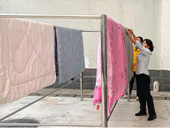 体验岗同学帮忙晾晒同学们的被子