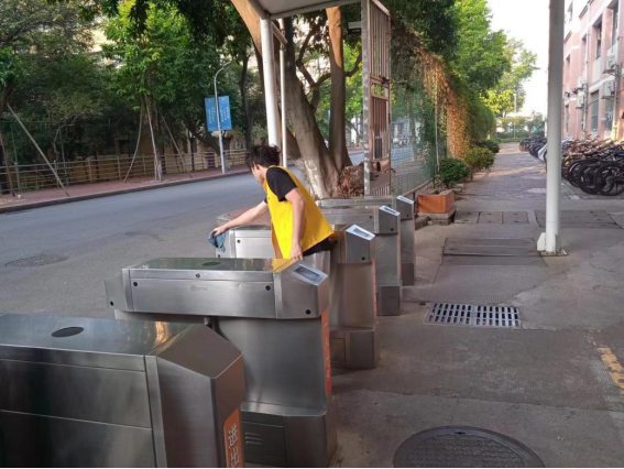 体验岗同学进行园区门禁卫生保洁工作