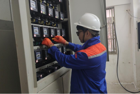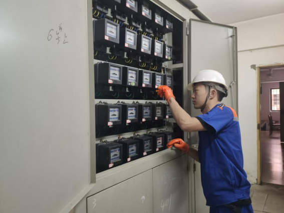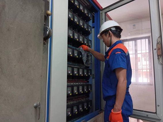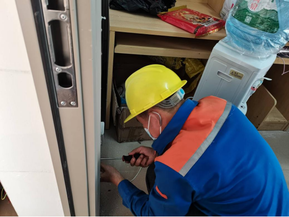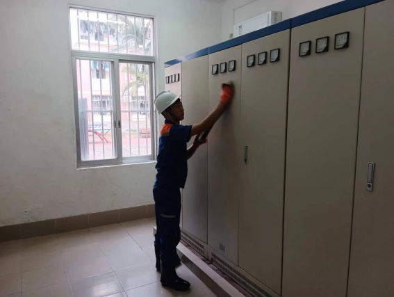 工作人员逐间对配电房进行线路排查,拧紧螺丝工作
