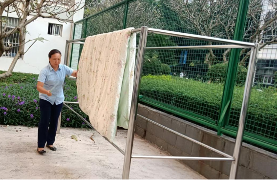 宿管阿姨晾晒同学们的被子