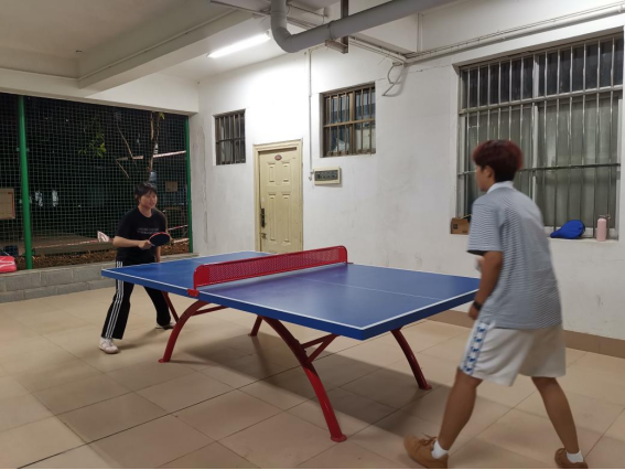 同学们在园区乒乓球桌打乒乓球