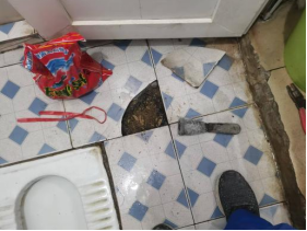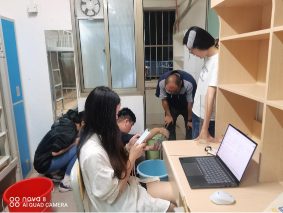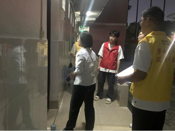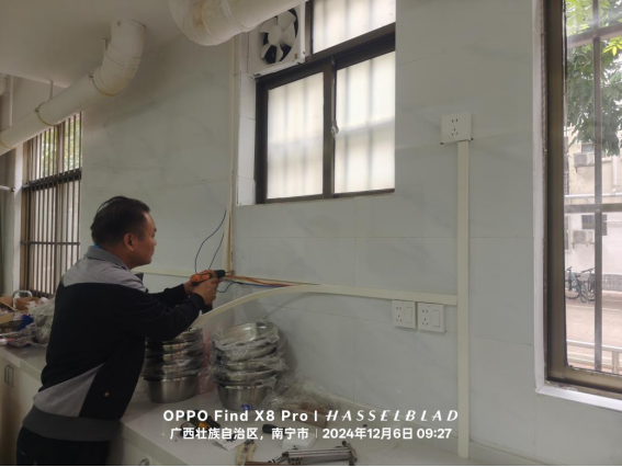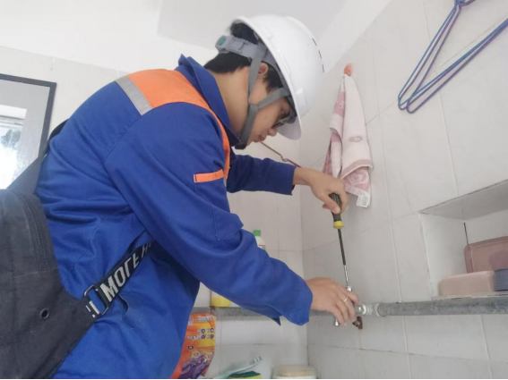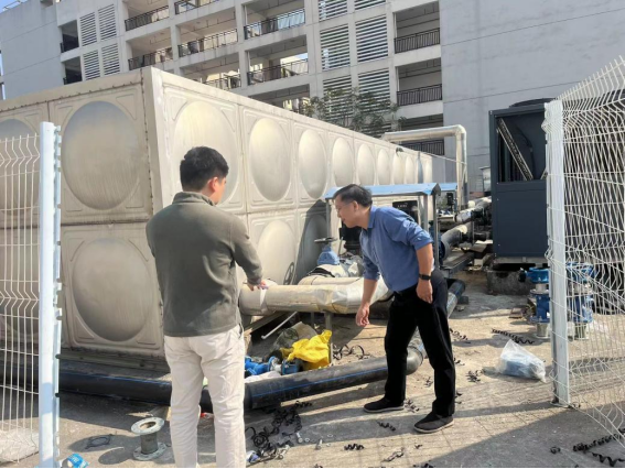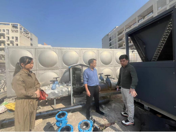 工作人员与热水施工方、学院老师到西23栋进行热水检测工作