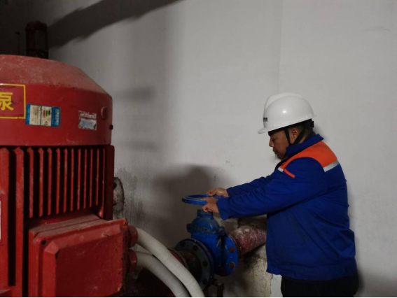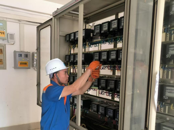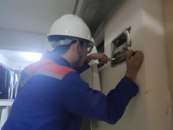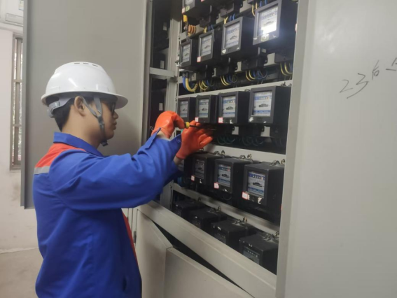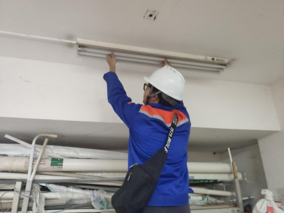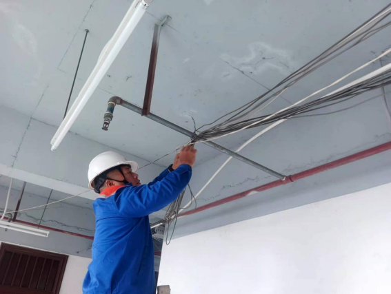 工作人员逐间对配电房进行线路排查,拧紧螺丝工作