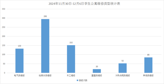 2024年11月30日-12月6日后勤服务24小时报修中心接电话报修、网上报修、现场报修1042单,其中学生公寓报修737单(已完工733单,完工率99.4%,余4单在维修中),其中电气类133单、给排水类295单、木工类152单、基建类20单、冷热水阀52单、其他类85单,余下305单由其他岗位负责完成维修。坚持对学生公寓84间配电房, 178个电表箱,2个水泵房每天巡检。