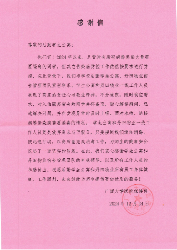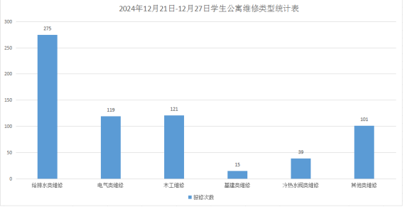 2024年12月21日-27日后勤服务24小时报修中心接电话报修、网上报修、现场报修934单,其中学生公寓报修670单(已完工666单,完工率99.4%,余4单在维修中),其中给排水类275单、电气类119单、木工类121单、基建类15单、冷热水阀39单、其他类101单,余下264单由其他岗位负责完成维修。坚持对学生公寓84间配电房, 178个电表箱,2个水泵房每天巡检。