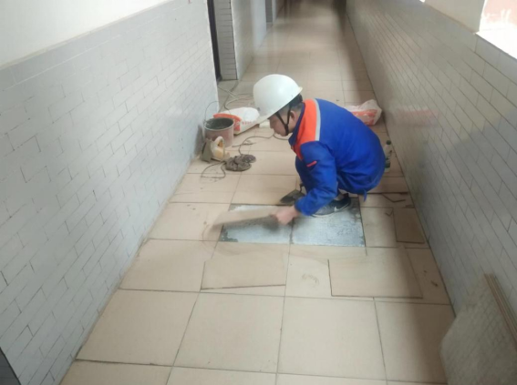 修复公共走廊破损的地板砖