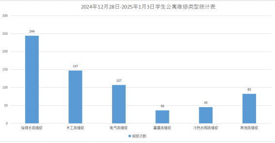 2024年12月28日-2025年1月3日后勤服务24小时报修中心接电话报修、网上报修、现场报修873单,其中学生公寓报修661单(已完工651单,完工率98.5%,余10单在维修中),其中给排水类244单、木工类147单、电气类107单、基建类36单、冷热水阀45单、其他类82单,余下212单由其他岗位负责完成维修。坚持对学生公寓84间配电房, 178个电表箱,2个水泵房每天巡检。