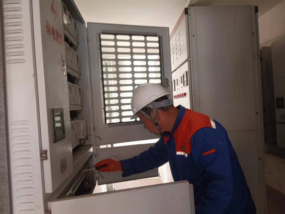 工作人员逐间对配电房进行线路排查,拧紧螺丝工作