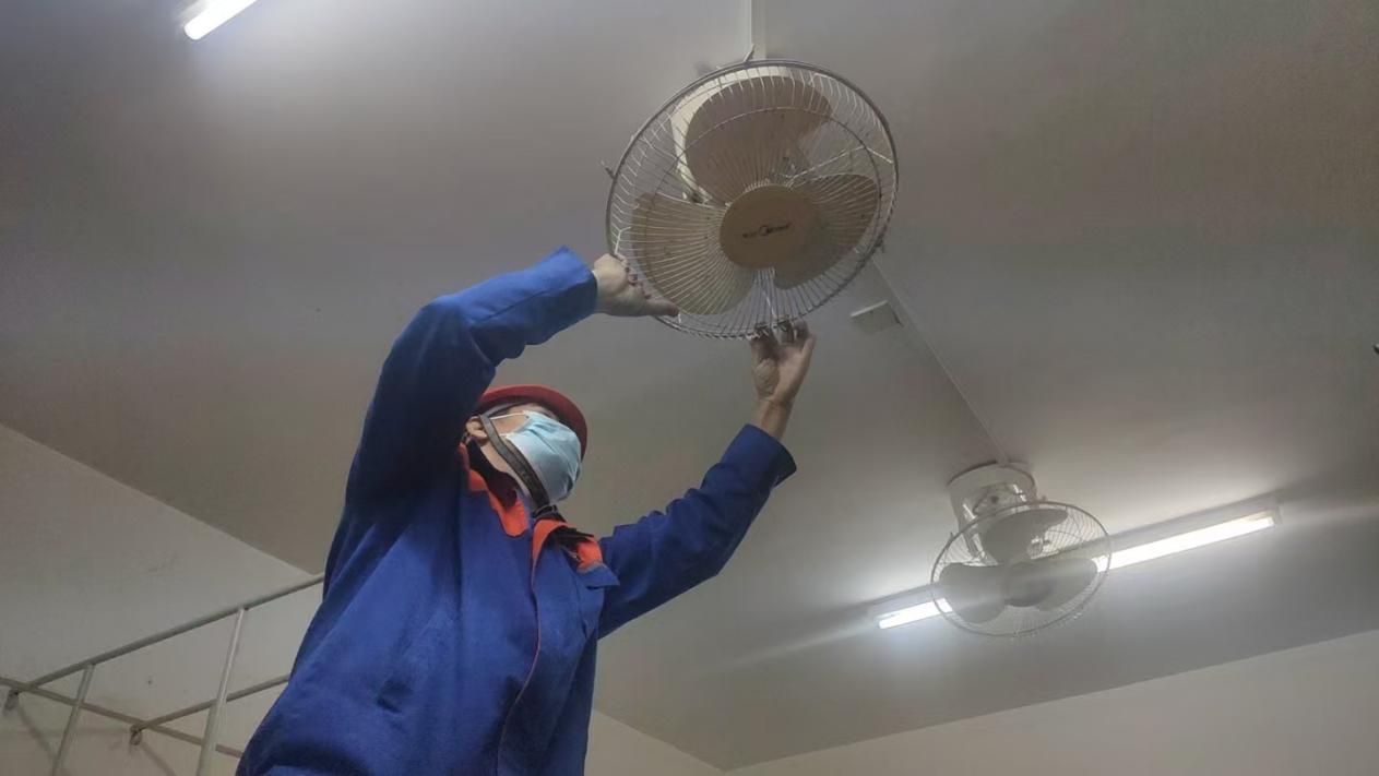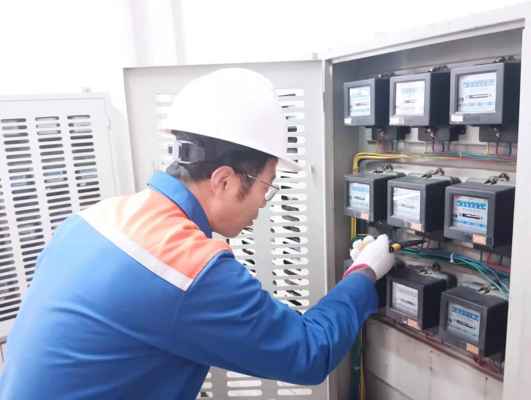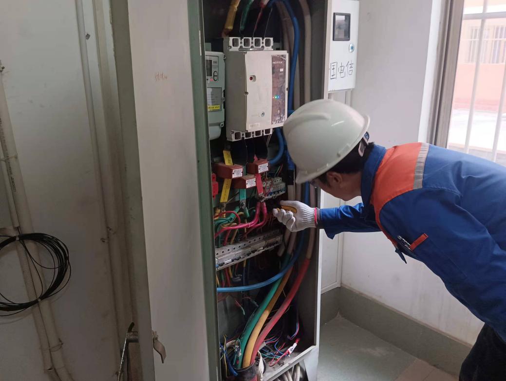 工作人员逐间对配电房进行线路排查,拧紧螺丝工作