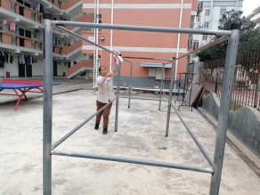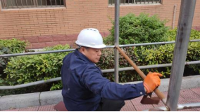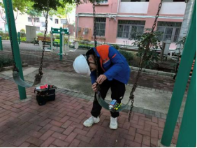 维修人员对生锈脱漆的公共晾衣架进行除锈喷漆处理