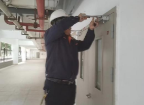 维修人员调整东31栋消防门闭合器