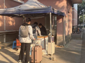 工作人员协助提前返校同学到非开放楼栋拿行李