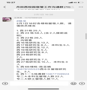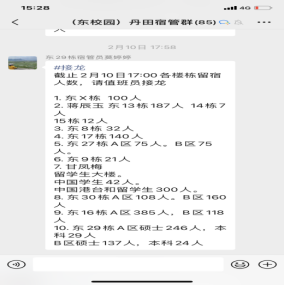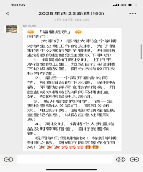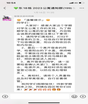 四、真诚守护,暖心陪伴。宿舍管理员尽职尽责,悉心照料留宿学生,严格执行假期留宿学生的出入登记制度,每日精准统计新增或离校学生人数,确保实时掌握留校学生的动态,及时调整宿舍门禁权限;密切关注学生的身心健康,悉心关怀他们的日常生活,通过宿舍群发布安全提示、天气预警等温馨通知共计244余条,营造安心舒适的留校生活。