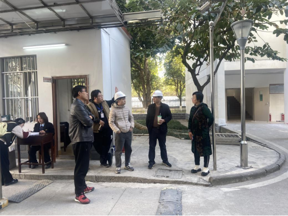 工作人员与施工队到东31-35栋现场对接施工改造项目