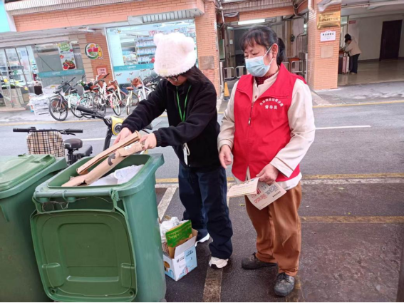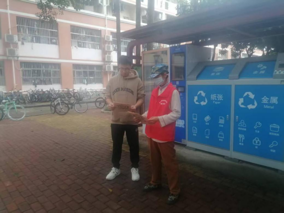 垃圾分类督导员引导同学分类垃圾