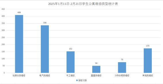 2025年1月11日-2月20日后勤服务24小时报修中心接电话报修、网上报修、现场报修1856单,其中学生公寓报修1194单(已完工1126单,完工率94.3%,余68单在维修中),其中给排水类408单、电气类336单、木工类152单、基建类50单、冷热水阀75单、其他类173单,余下662单由其他岗位负责完成维修。坚持对学生公寓84间配电房, 178个电表箱,2个水泵房每天巡检。