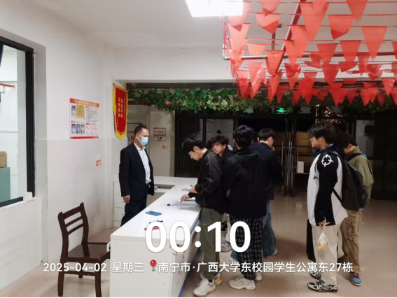 春季第六周学生公寓各项服务工作有序开展, 本周办理宿舍业务5874人次(其中办理外宿6人,调宿学生3人,入住学生2人,其他业务71人, 晚归登记5792人次);走访宿舍246人次;办理3月批毕业生毕业审核32人次;开展学生宿舍固定资产盘查11700多件次;粘贴固定资产标签8200多张;考评小组开展学生公寓物业服务考评工作。