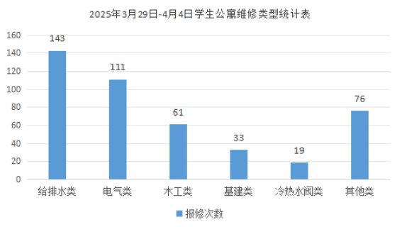 2025年3月29日-4月4日学生公寓共接单443单,其中给排水类143单、电气类111单、木工类61单、基建类33单、冷热水阀19单、其他类76单,已完工424单,完工率95.7%,余19单在维修中。坚持对学生公寓84间配电房, 178个电表箱,2个水泵房日常巡检。