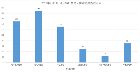 2025年4月12日-4月18日学生公寓共接单614单,其中给排水类150单、电气类189单、木工类131单、基建类50单、冷热水阀24单、其他类70单,已完工597单,完工率97.2%,余17单在维修中。坚持对学生公寓84间配电房, 178个电表箱,2个水泵房日常巡检。