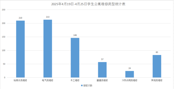 2025年4月19日-4月25日学生公寓共接报修单733单,其中给排水类210单、电气类213单、木工类146单、基建类57单、冷热水阀24单、其他类83单,已完工717单,完工率97.8%,余16单在维修中。坚持对学生公寓84间配电房, 178个电表箱,2个水泵房日常巡检。