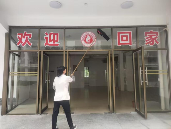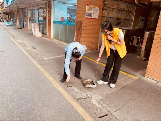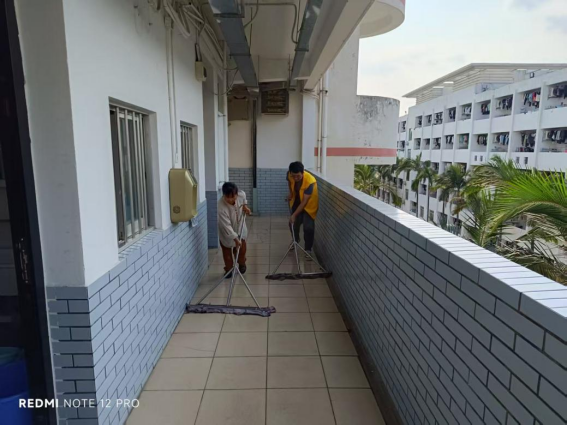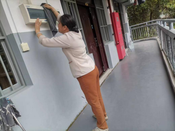 劳动教育岗同学协助阿姨进行楼栋卫生保洁工作