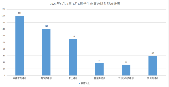 2025年5月31日-6月6日学生公寓共接单562单,其中给排水类181单、电气类141单、木工类110单、基建类37单、冷热水阀33单、其他类60单,已完工555单,完工率98.75%,余7单在维修中。坚持对学生公寓84间配电房, 178个电表箱,2个水泵房日常巡检。