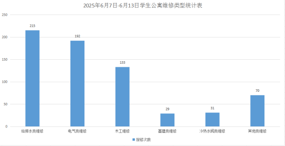 2025年6月7日-13日学生公寓共接单670单,其中给排水类215单、电气类192单、木工类133单、基建类29单、冷热水阀31单、其他类70单,已完工657单,完工率98.06%,余13单在维修中。坚持对学生公寓84间配电房, 178个电表箱,2个水泵房日常巡检。