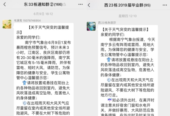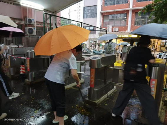 为切实做好汛期安全保障工作,学生公寓对园区内配电设施、楼栋天面、地下排水等关键部位开展了全面检查,发现问题立即整改并上报。本周持续出现强对流天气,学生公寓通过各楼栋学生微信群累计发布912次温馨提示,提醒同学们及时做好防范措施。