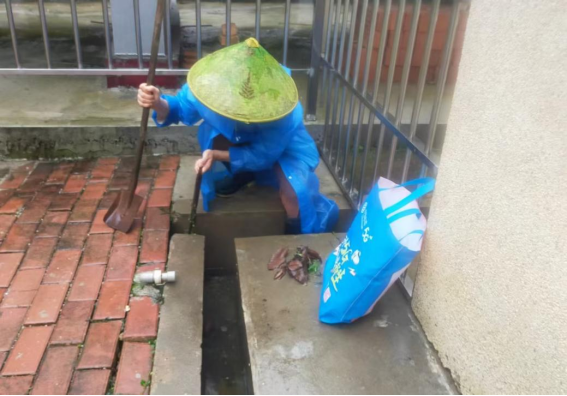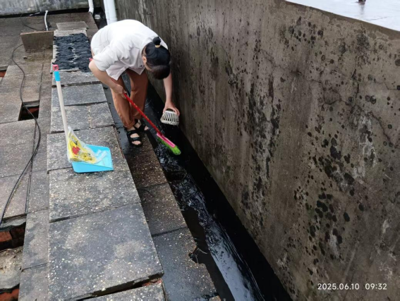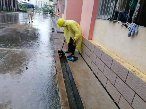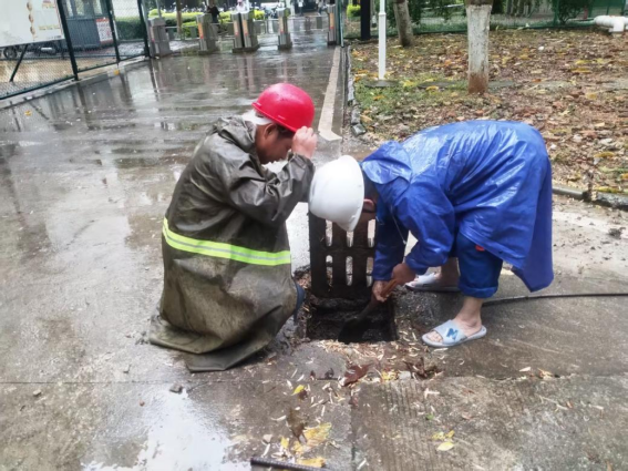 工作人员疏通园区排水系统