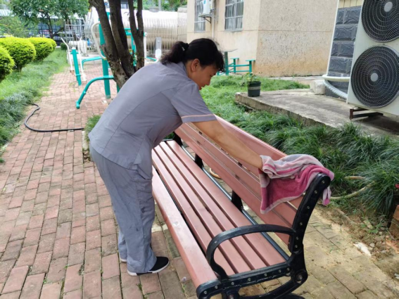 为营造学生公寓园区宜学宜居的环境,认真做好园区内消防设备设施、热水机组、洗涤设备等各种设备设施和41间自习室、15个多功能室的保洁维护工作;做好学生公寓园区内547个生活设施(其中公共长椅147张,乒乓球桌117张,晾衣架173个、健身器材110个)的维护工作。
