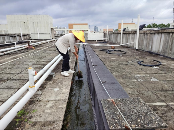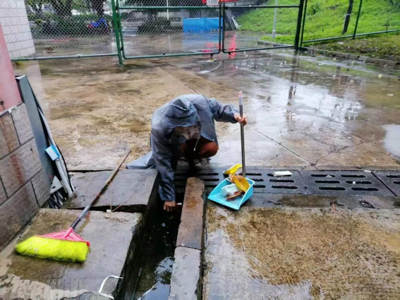 工作人员疏通园区排水系统
