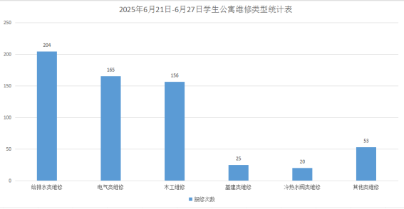 2025年6月21日-6月27日学生公寓共接单623单,其中给排水类204单、电气类165单、木工类156单、基建类25单、冷热水阀20单、其他53单,已完工610单,完工率97.91%,余13单在维修中。坚持对学生公寓84间配电房, 178个电表箱,2个水泵房日常巡检。