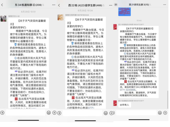 学生公寓多措并举应对近期强对流天气,通过全面安全排查筑牢住宿安全防线。工作人员重点加强园区巡查与隐患整治,对发现的问题及时记录并上报整改。针对本周持续出现的强对流天气,学生公寓在各楼栋学生微信群累计发布152条安全提示,及时提醒同学们做好防范措施,确保住宿安全。