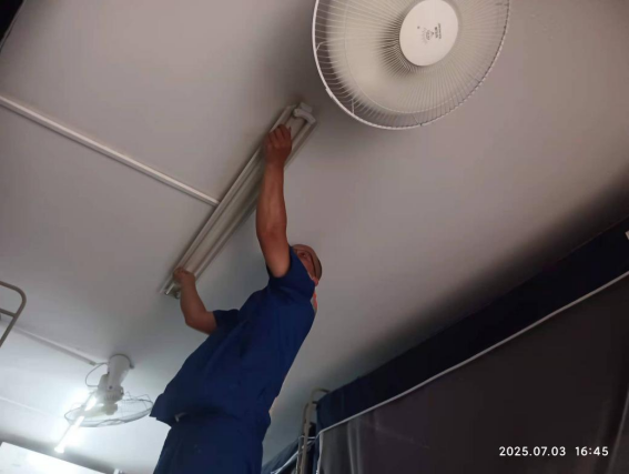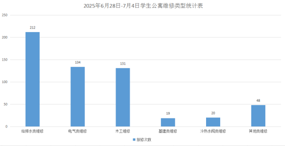 2025年6月28日-7月4日学生公寓共接单564单,其中给排水类212单、电气类134单、木工类131单、基建类19单、冷热水阀20单、其他48单,已完工549单,完工率97.34%,余15单在维修中。本周对毕业生房进行局部除锈涂漆196个生锈铁架床,完成毕业生房土建类检修120间,小型水电类检修184间,木工类检修47间。坚持对学生公寓84间配电房, 178个电表箱,2个水泵房日常巡检。