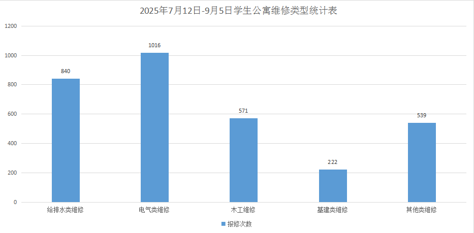 2025年7月12日-2025年9月5日学生公寓共接单3188单,其中给排水类840单、电气类1016单、木工类571单、基建类222单、其他类539单,已全部完工。