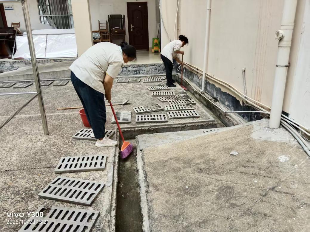 本周对东8-11栋、东13园区、东31栋进行绿化带修剪及除草面积约7141.07平方米;各园区进行日常保洁约19万平方米,本周清理学生公寓86条明沟7次累计长度20846米;清理暗沟64条1次长度2251米。27个楼栋天面排水设施淤泥清理1次。