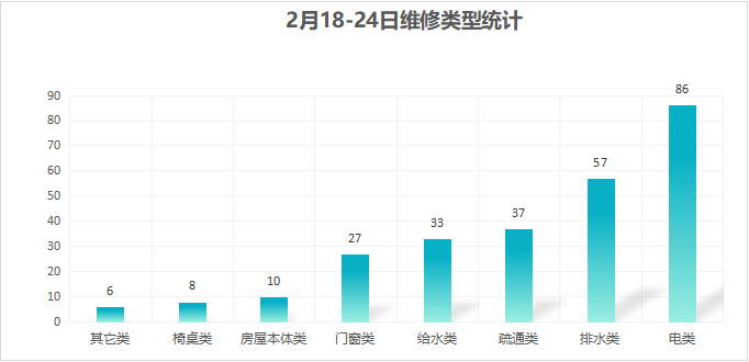 3、对学校公共设施进行日常巡查、维护维修。本周共接单264单,其中电类86单,给水类33单,门窗类27单,排水类57单,疏通类37单,房屋本体类10单,桌椅类8单,其他类6单,完成238单。