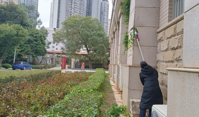 1、清除公共楼宇外围寄生绿植34次,清理公共楼宇排水设施43次,冲洗公共楼宇露天区域3栋;清理公共楼宇天台9栋。