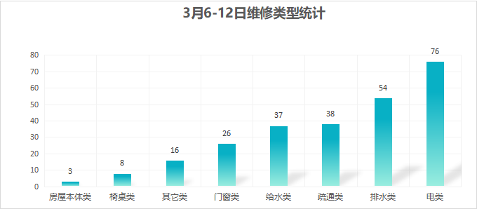 对学校公共设施进行日常巡查、维护,发现问题及时维修、抢修。师生报修问题随报随修,确保公共设施正常运行。本周共接单258单,其中电类76单,给水类37单,门窗类26单,排水类54单,疏通类38单,房屋本体类3单,桌椅类8单,其他类16单,完成233单。