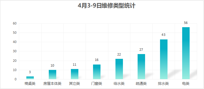 对学校公共设施进行日常巡查、维护,发现问题及时维修、抢修。师生报修问题随报随修,确保公共设施正常运行。本周共接单188单,其中电类56单,给水类22单,门窗类单16,排水类43单,疏通类27单,房屋本体类10单,桌椅类3单,其他类11单,完成176单。