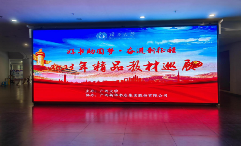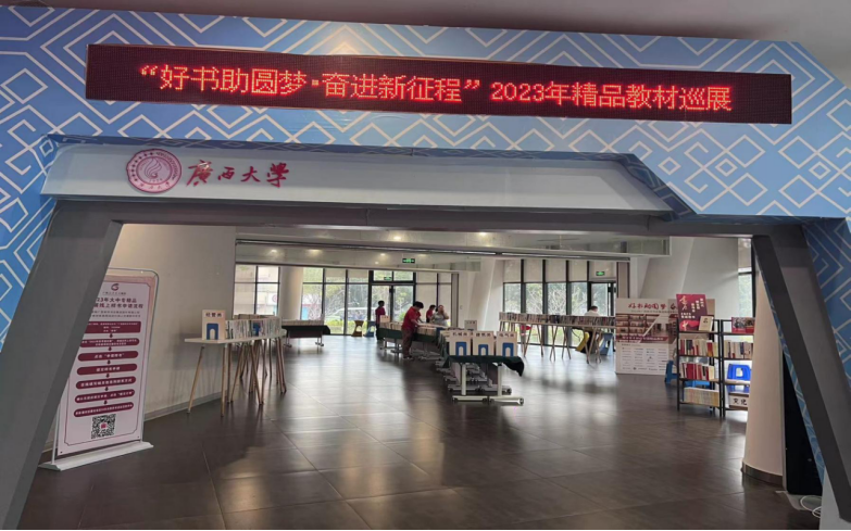 4月3日,为进一步贯彻党的二十大精神,助力学校教育教学,提高教材优选率,我校联合广西新华书店集团股份有限公司在大学生活动中心举办“好书助圆梦·奋进新征程”精品教材校园巡展活动,巡展的教材主要是精选2021年以来出版的国家级优秀教材、省级优秀教材、行业优秀教材、“十四五”规划教材、“十三五”规划教材等获奖精品教材,涉及外语类、财经类、商贸类、机电类、农林类、计算机类、医药卫生类、师范类、建筑类、化工类、旅游类、艺术类等专业,共计4000余册。