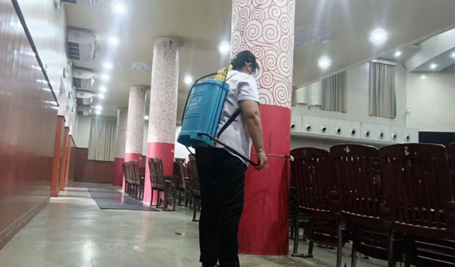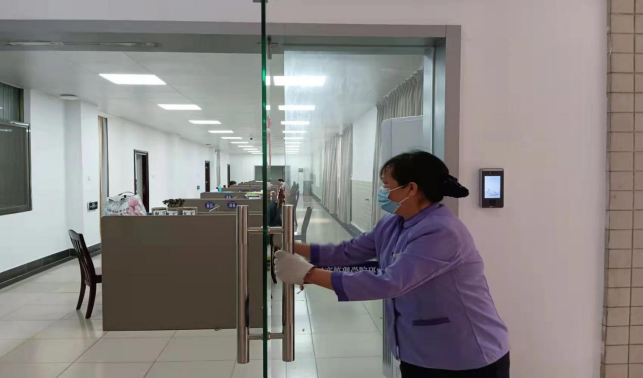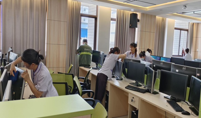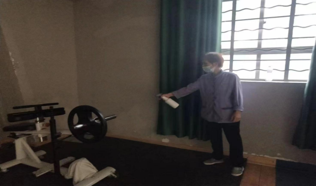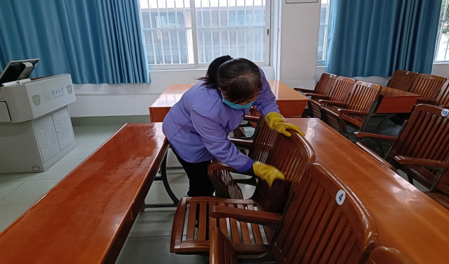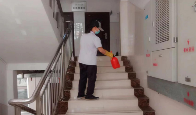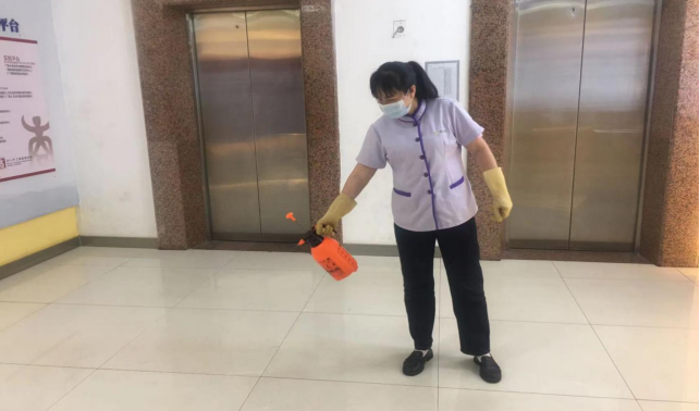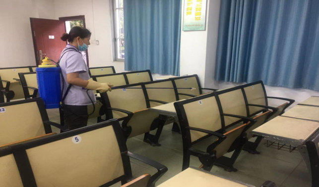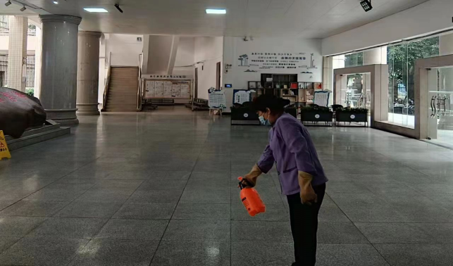 本周对公共教学楼宇的楼梯、走廊、门把手、课桌椅、电脑键盘、鼠标、水龙头、楼梯扶手、电梯间及按钮等高频接触表面进行重点杀菌消毒855次。