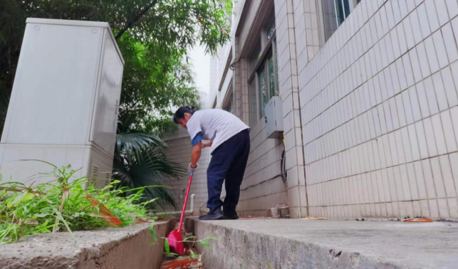本周对语言中心、二教、三教、六教、十教、十一教、研究生院和行健学院一教、二教、四教共11栋教学楼宇进行日常卫生保洁服务工作,清除公共楼宇外围寄生绿植1次,清理公共楼宇排水设施39次,清理公共楼宇天台32栋。